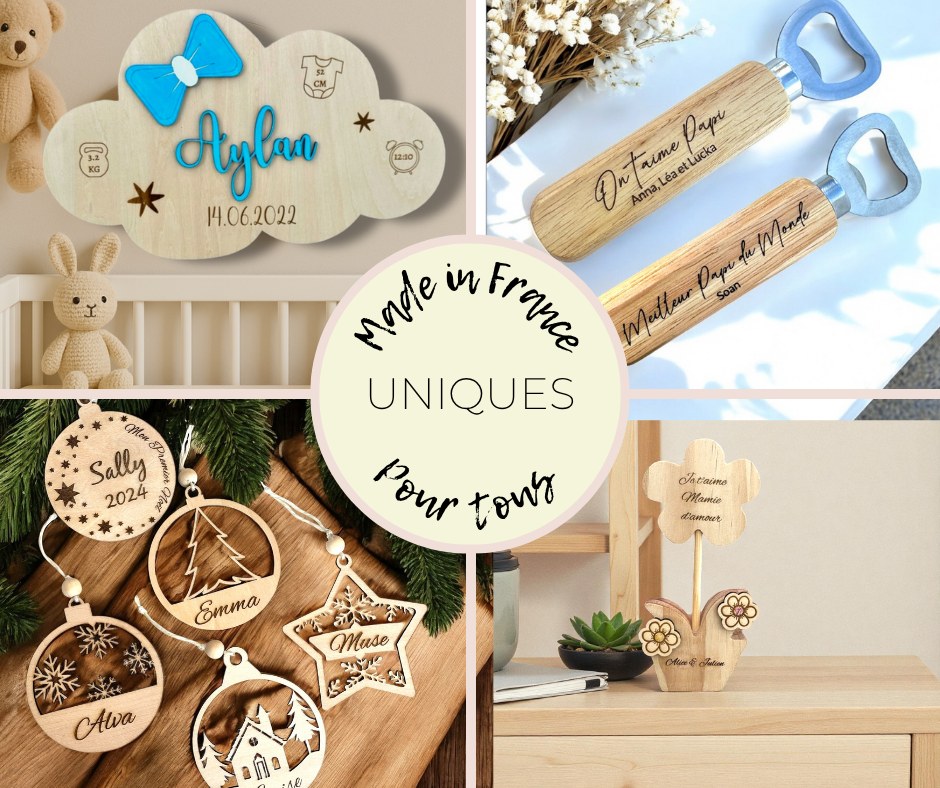 Découvrez nos créations artisanales en bois personnalisées, pensées avec amour pour chaque membre de la famille et pour chaque événements: Naissance, Baptême, Anniversaire, Noël, Rencontre, Mariage ou encore Fête des Mères et Pères… ou tout simplement pour faire plaisir ou dire Merci.