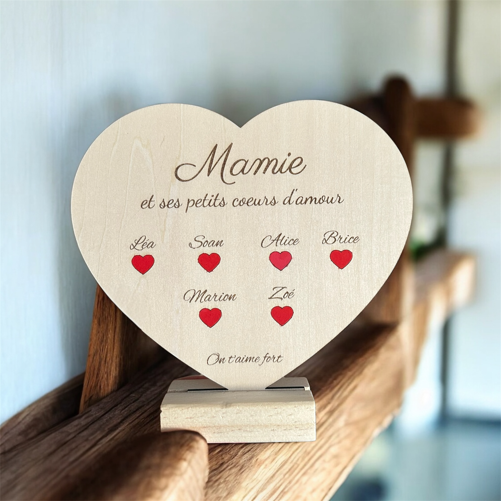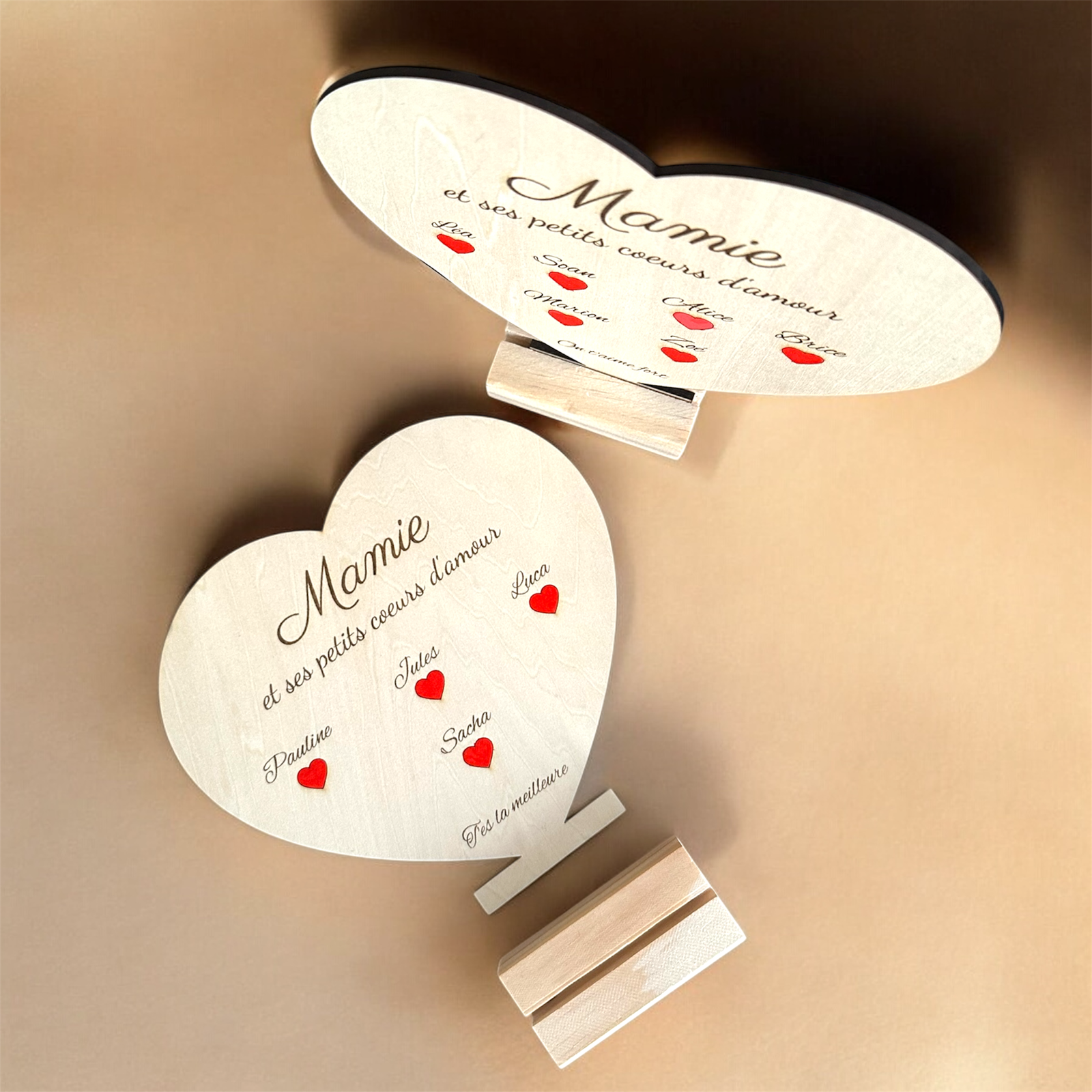 Petits cœurs gravés pour chaque prénom ❤️ Socle en bois inclus