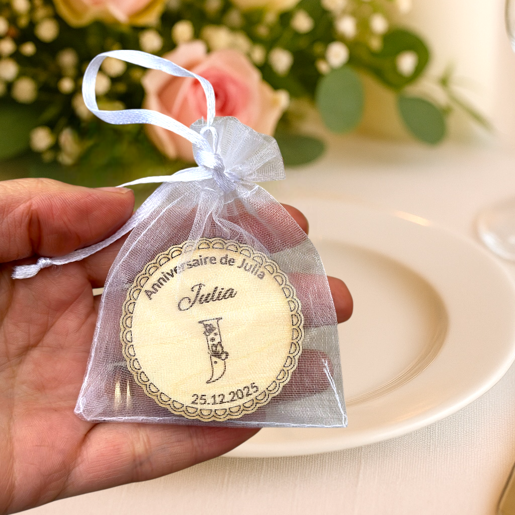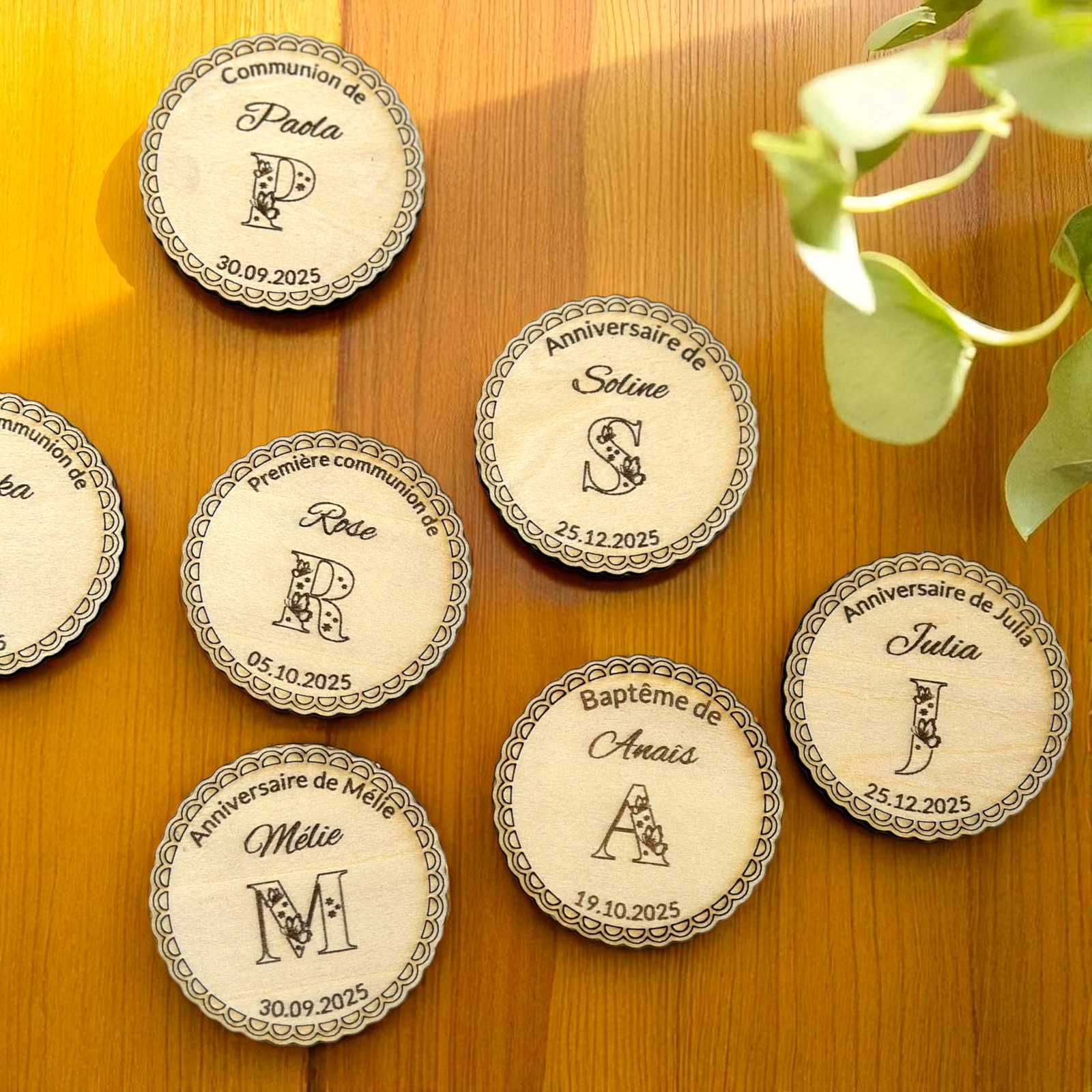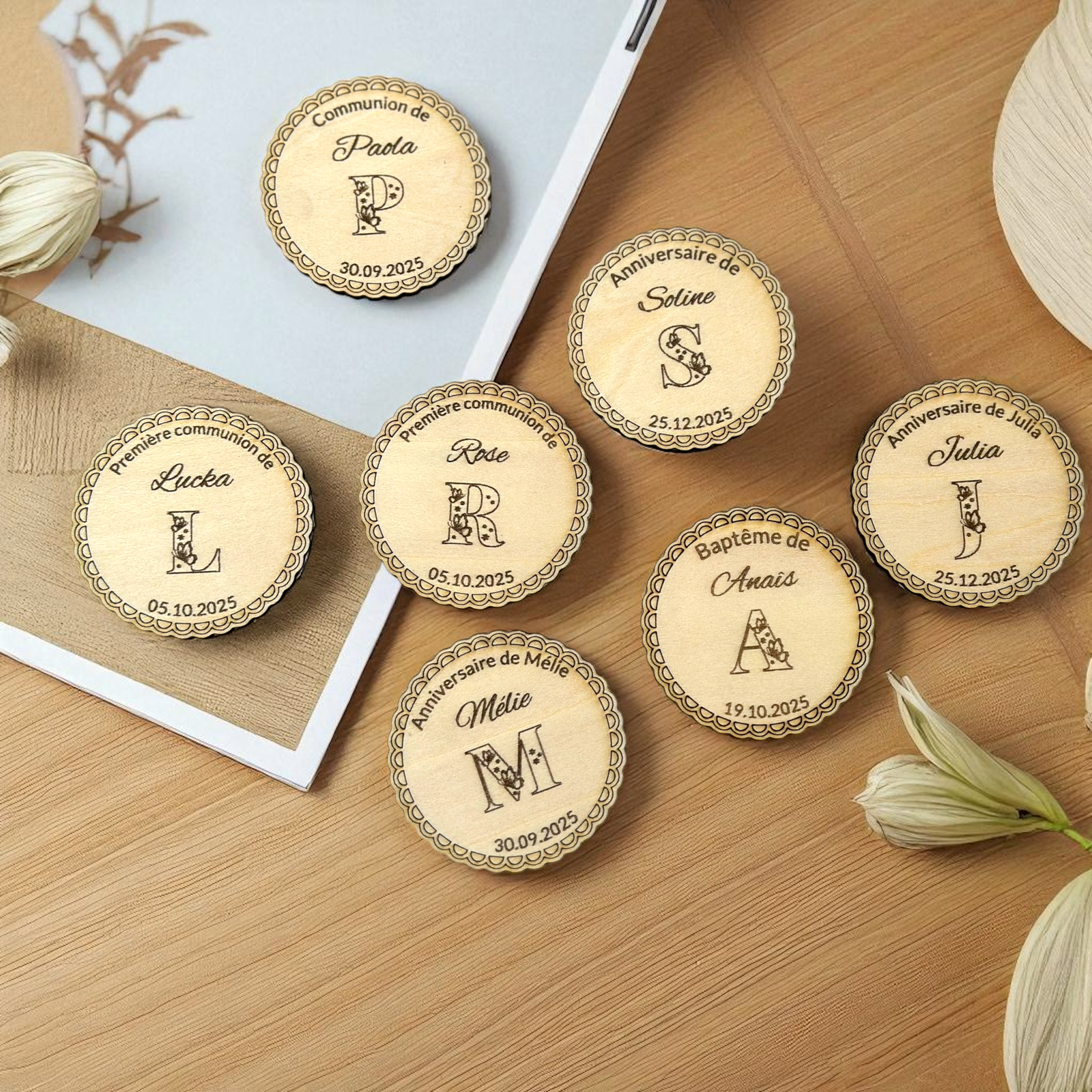 Ces magnifiques magnets en bois gravés au laser sont parfaits pour célébrer vos événements spéciaux : baptême, première communion ou anniversaire.