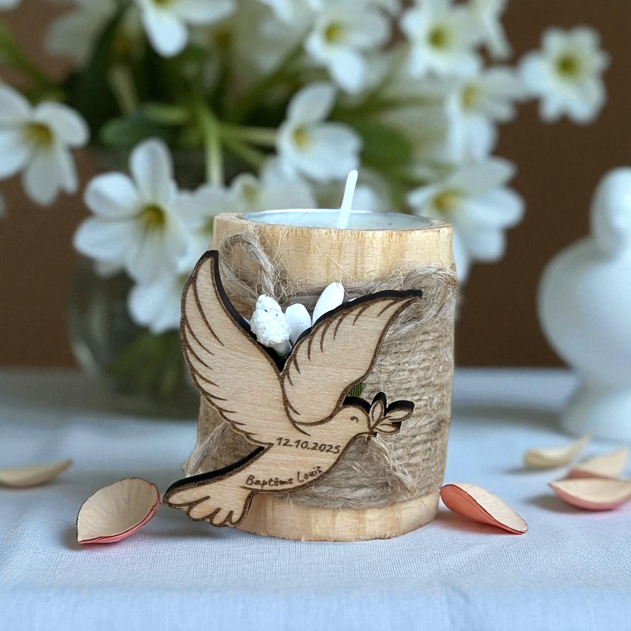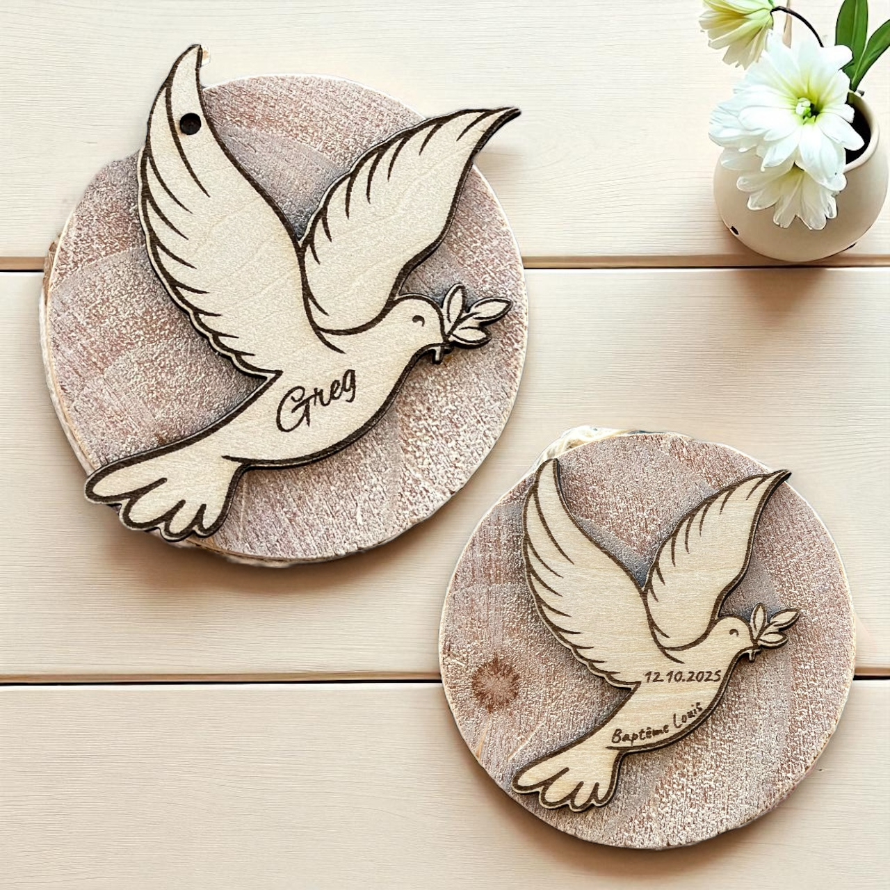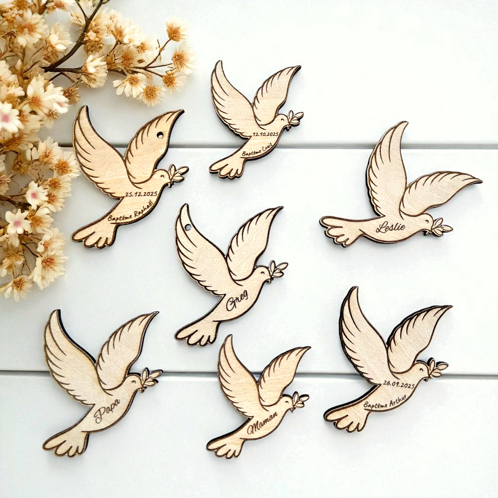 Apportez une touche unique et symbolique à votre événement avec ces marque-places / étiquettes en bois en forme de colombe. Parfaites pour un baptême, une communion, un mariage ou toute cérémonie religieuse, ces jolies colombes en bois gravé personnalisées avec les prénoms de vos invités feront à la fois office de décoration et de souvenir inoubliable.