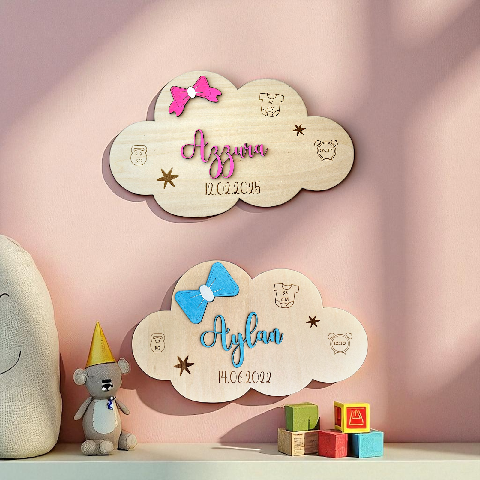 Chaque plaque est en forme de nuage avec des gravures délicates (body, réveil, balance), des étoiles décoratives, et un nœud en couleur selon le sexe de l’enfant :