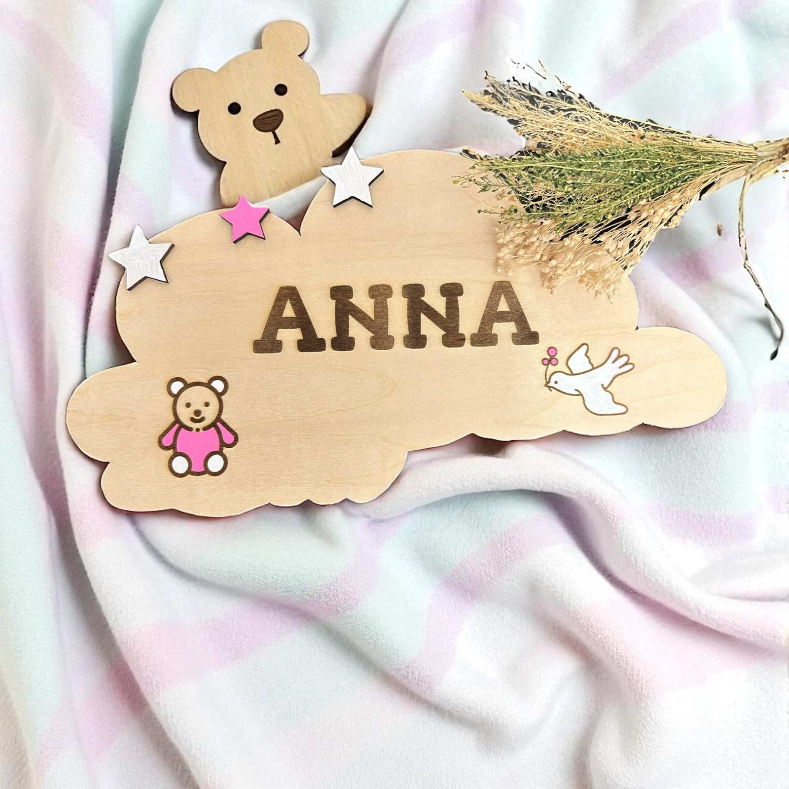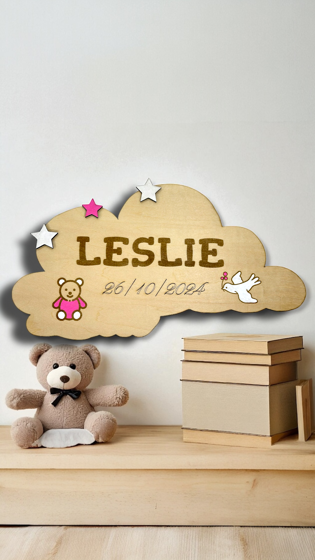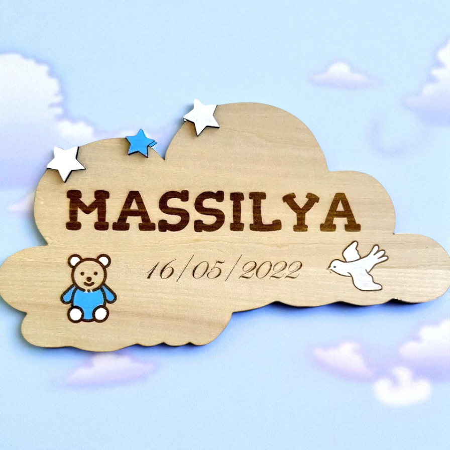 Apportez une touche de douceur à la chambre de votre enfant ou à votre événement avec cette magnifique plaque en bois en forme de nuage. Entièrement personnalisée avec le prénom, la date et de jolis motifs colorés (ourson, colombe, étoiles), elle est parfaite pour une naissance, un baptême ou un cadeau de naissance.